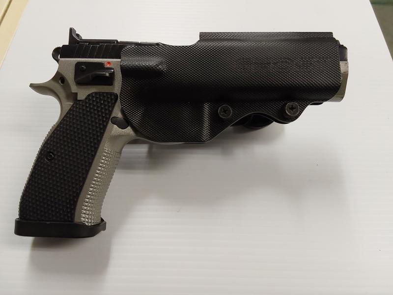 Description:CZ 75 tactical sporting 9mm single action semi auto pistol being sold with three magazines and ghost competition holster all excellent condition