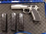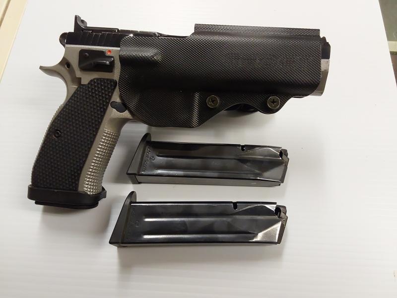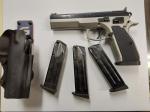 Description:CZ 75 tactical sporting 9mm single action semi auto pistol being sold with three magazines and ghost competition holster all excellent condition