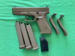 Accessories:Glock 19X Brings A Lot to the Table. The Glock 19X is Glock’s first “crossover” pistol, it adds the full-size Glock 17 polymer frame to the smaller Glock 19 all-metal slide. The 19X has ambidextrous controls, and the company lauds its excellent accuracy due to the GLOCK Marksman Barrel, a polygonally rifled barrel. The nPVD slide coating keeps the corrosion down to a minimum. It’s “coyote colored” rather than the classic black that Glock is known for.
