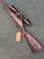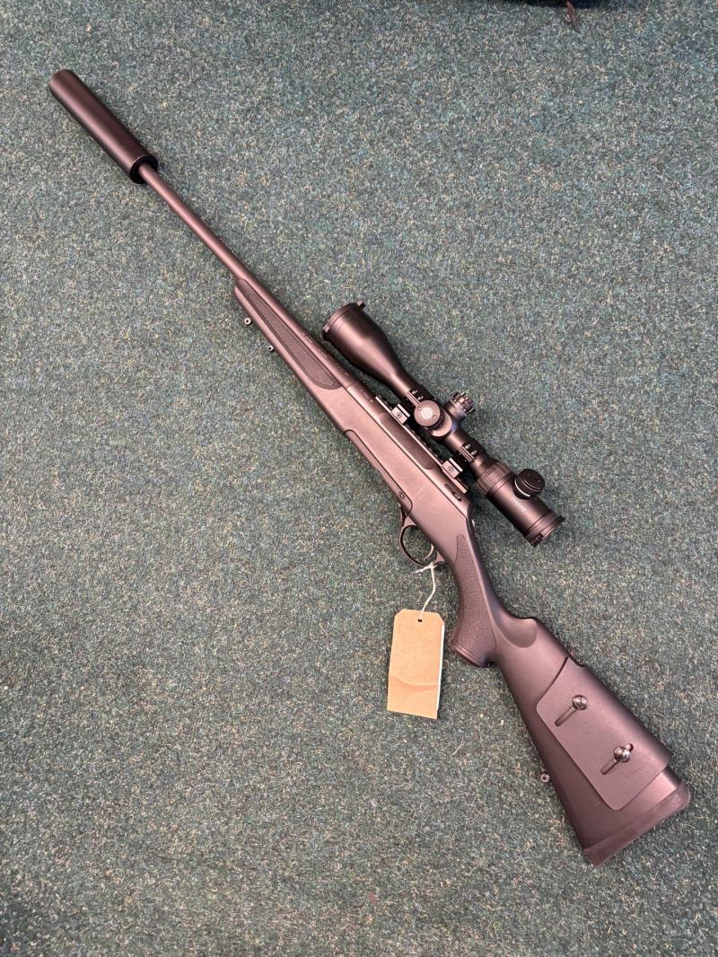 Accessories:Haenel Jaeger 10 pro 223 bolt action rifle. Black synthetic right hand stock with adjustable comb. RCC Hunter sound moderator. Hawke vantage 3-12x50 scope. Package £695 trade in £650 cash as new condition