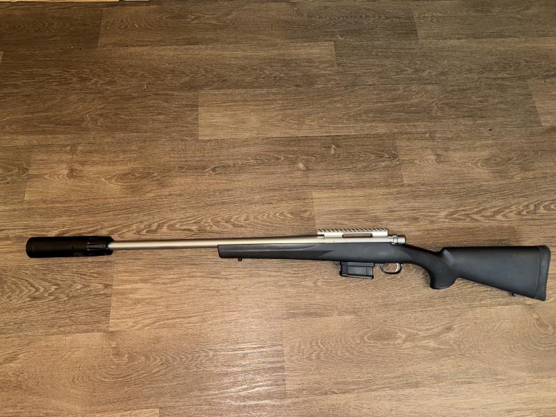 Description:Stainless 1500 with varmint barrel complete with ATEC H2 moderator all in fantastic order.