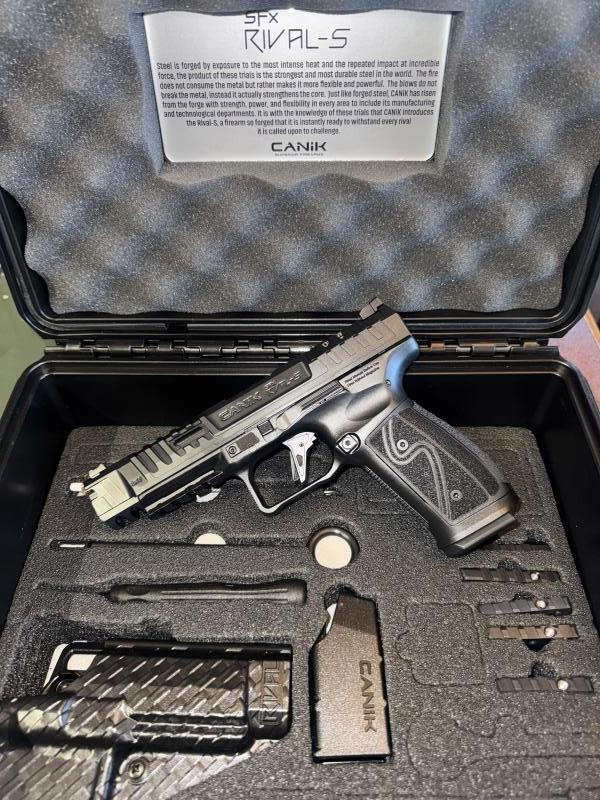 Description:Finally back in stock and last few left the Canik Rival Steel frame is an exceptional pistol coming in a very complete package which includes optic plates, holster and extensive cleaning kit. The trigger has a crisp light break which combined with all the other quality features make this pistol perfect for IPSC production or optic production division as well as being very accurate and suitable for precision disciplines. Only one left in the very popular chrome finish.