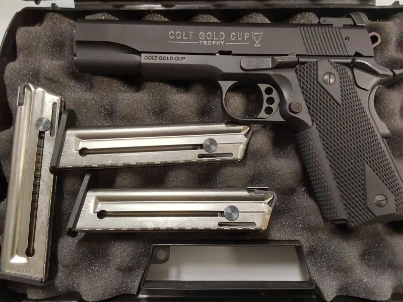 Description:Colt Gold Cup Trophy .22 semi auto pistol manufactured by Waliher ,excellent condition with three magazines and original box