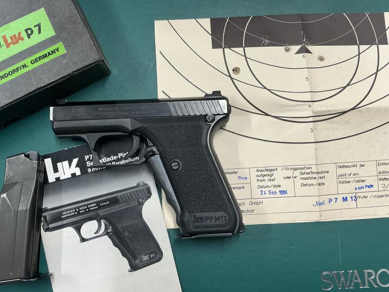 Description:H&K P07 m13 squeeze cock pistol in 9mm, a fairly rare pistol in exceptional condition, boxed with 2 mags, test target shot in 1984 and its instruction booklet. According to google the p07 h&k was the most expensive handgun that was factory produced for the police.. an extremely accurate shooting pistol and would make a lovely collectors item.