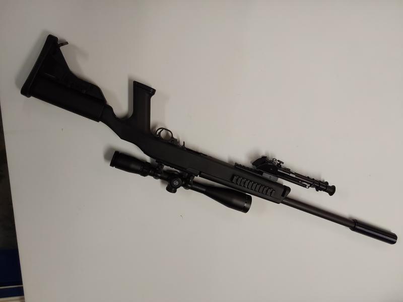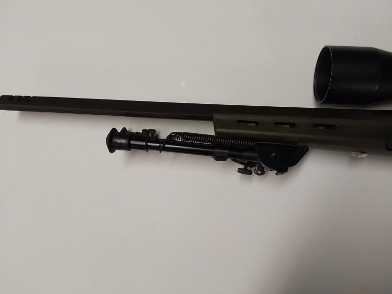 Ruger 10/22 with black hammer forged target barrel screw cut, tactical composit stock Harris bipod sound moderator fitted with Hawke varmint 6-24×45...