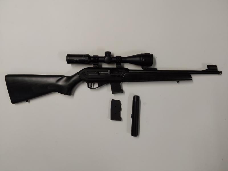 CZ 512 .22WMR semi auto rifle black wood stock iron sights plus Hawke 4-12×40 AO Rimfire .22WMR IR scope, mounts and two magazines plus sound modera...