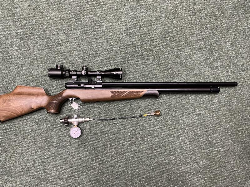 Theoben .20 12/200 rapid air rifle topped with a 3-9x40 Simmons riflescope in 1st class condition, has had 1 owner from new. Charging cylinder is with...