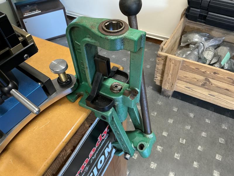 Rcbs rockchucker press fitted with a lock and load conversion kit for quick change of reloading dies