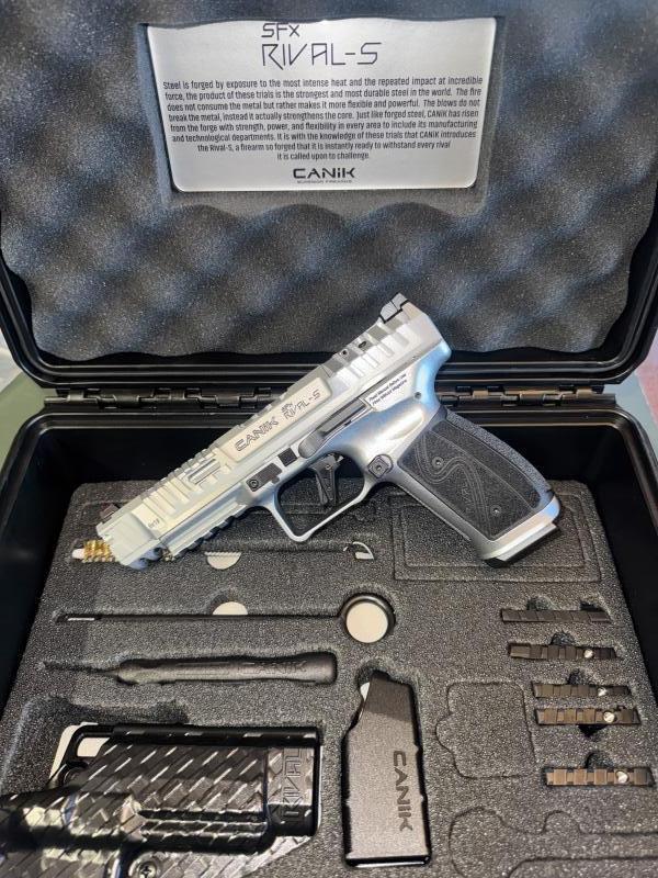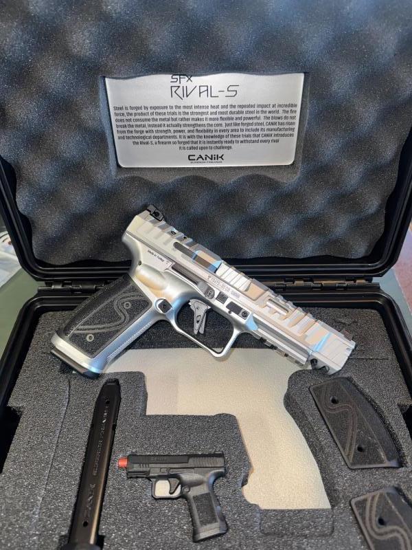 Description:Finally back in stock and last few left the Canik Rival Steel frame is an exceptional pistol coming in a very complete package which includes optic plates, holster and extensive cleaning kit. The trigger has a crisp light break which combined with all the other quality features make this pistol perfect for IPSC production or optic production division as well as being very accurate and suitable for precision disciplines. Only one left in the very popular chrome finish.