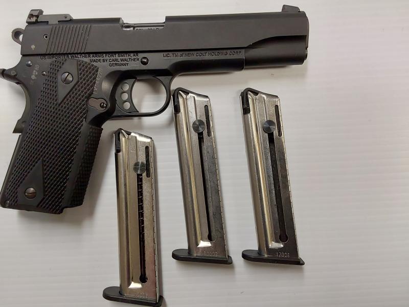 Description:Colt Gold Cup Trophy .22 semi auto pistol manufactured by Waliher ,excellent condition with three magazines and original box