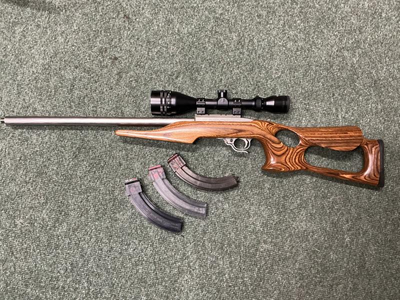 Accessories:A ruger match stainless steel barrel, screw cut for a moderator, laminated thumb hole stock, extender mag release and topped with a Tasso 3-9x50 riflescope, has 3no 25 rd mags